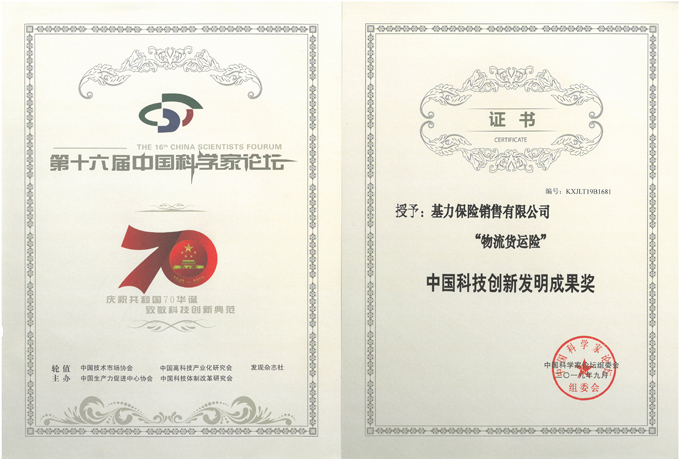 “物流货运险”中国科技创新发明成果奖-证书